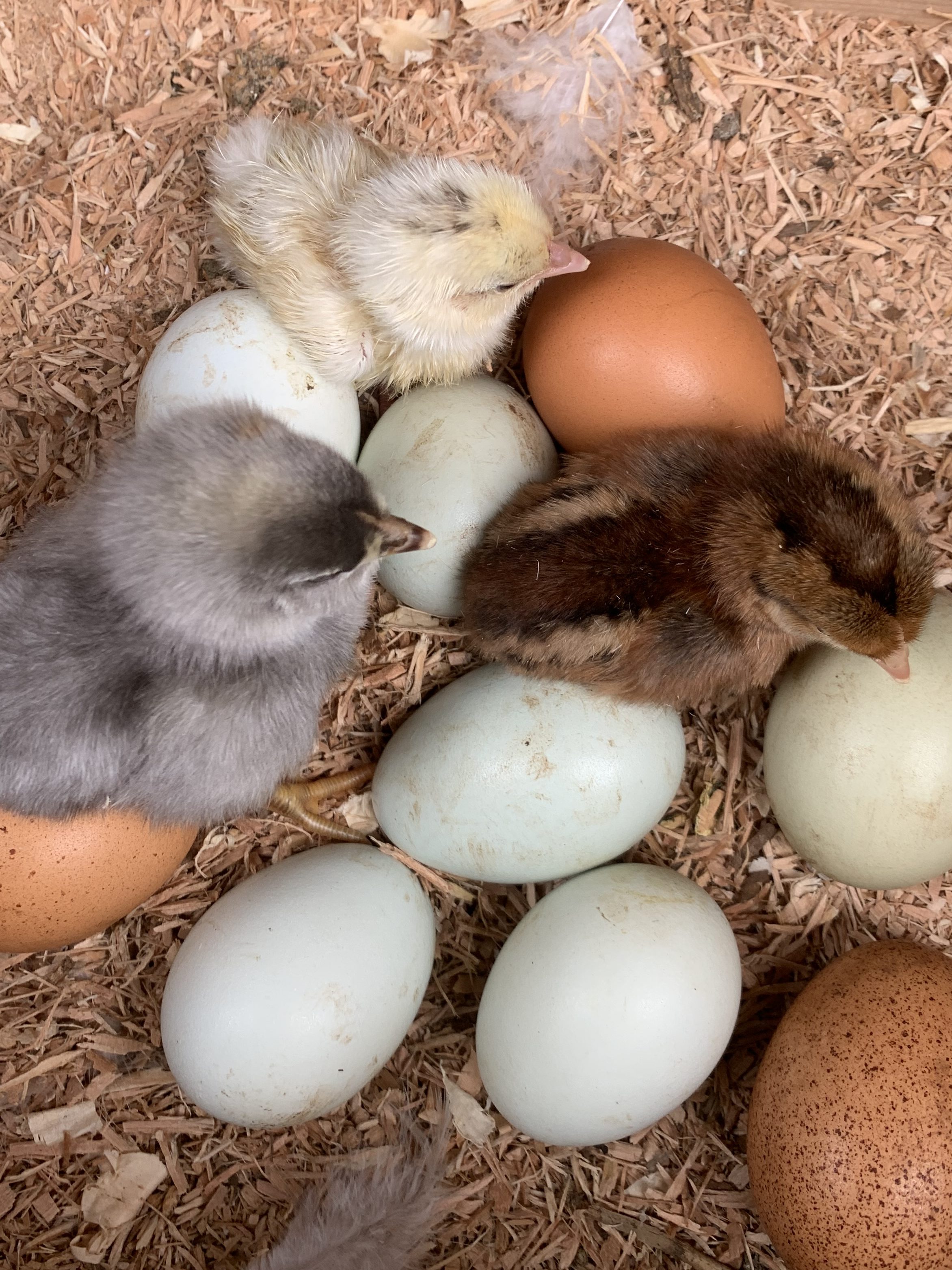 One of our chicks ordered last year went broody this spring and hatched our first batch of barnyard mix chicks born on the farm! Welcome, babies!
